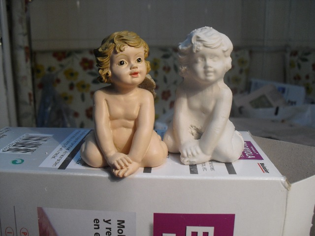 La figura del angelito de la muestra solo hice la parte delantera que es la más dificil, luego se retoca y ya está, ´la parte posterior la voy a hacer con porcelana fria, porque es fácil. Si la figura es más complicada hago las dos partes y luego las uno con cuidado, pero de esta manera he hecho pocas, me interesa sólo la parte más complicada de la cabeza. Lo que más hago son manos y pies cuando hago alguna figura en porcelana, son también dificiles de hacer y así salen muy bien, o detalles como cabeza de animales para adornos,o cualquier otro objeto.