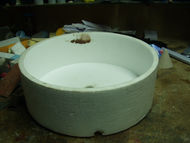 3. Lo colocamos boca abajo, y lo rellenamos de escayola. Esperamos a que seque, desmoldamos y ya tendremos nuestra piedra. Repetimos el proceso cuantas veces queramos para hacer más piedras.