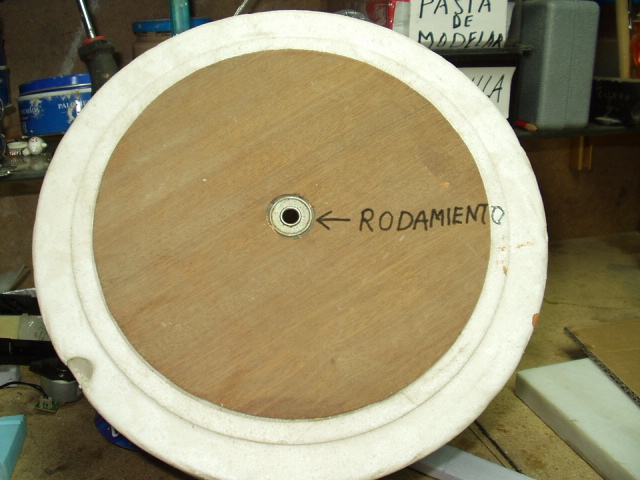 7. A la base de la tarta, le hacemos un agujero en el centro por el que pasará el eje anterior. ¡IMPORTANTE!, para que no haya fricción sobre el eje y la base de la tarta con lo que se frenaría el movimiento y no podríamos colgar peso ninguno, a la base de la tarta (boca abajo), le he pegado un trozo de panel y un rodamiento (se ve en la foto). El rodamiento nos permite colgar el peso que queramos sin que el motor sufra por el exceso de fricción.