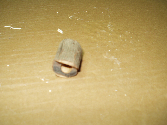 8. El eje sobresaliente de la base boca abajo, lo camuflaremos con un tronquito al que le haremos un taladro del grosor del eje como en la foto. El eje debe sobresalir un centímetro o dos del tonquito para después colocar la viga transversal que será donde colgaremos el burro.