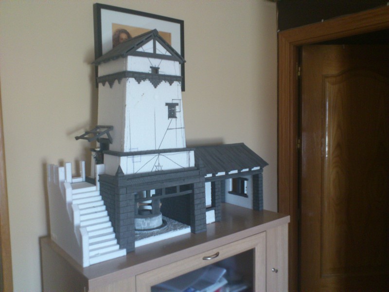 Además necesitaría opinión. Cuando estuve haciendo los tejado tanto del establo como de la torre, pensé que lo mismo le quedaba bien si le hacía un tejadillo a la puerta, pero no me terminó de convencer. Tenía el "esqueleto" preparado y al poner la escalera y sobreponerlocon alambres no me ha desagradado, asi que necesito segundas opiniones XD.