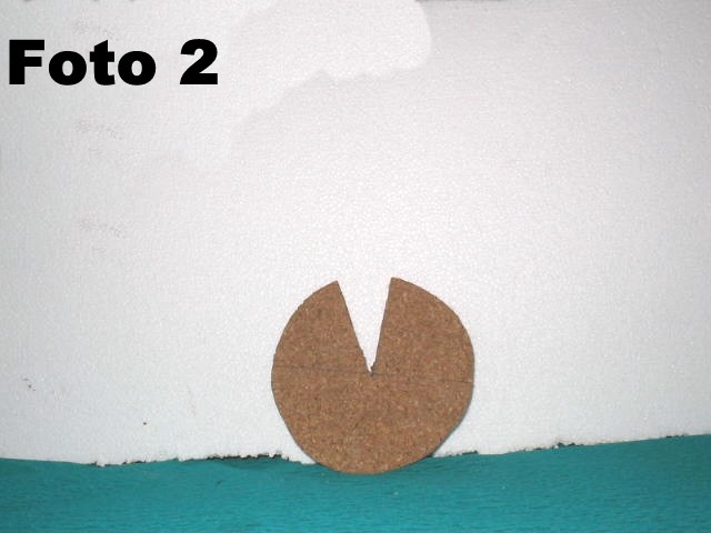 2º Cortamos un circulo de corcho natural, de 10,5 cm. de diámetro y le quitamos una porción, en forma de triangulo de 2 cm. de base * 5,5 de alto. y con una lima pequeña y después lija, repasamos los cantos del circulo, Foto 2.