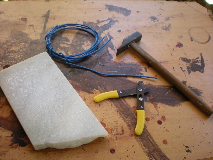 1- Os presento los materiales empleados para la fabricación de mis monedas: Cable de cobre semi-rigido, alicates pelacable o de corte, martillo y una placa de mármol.