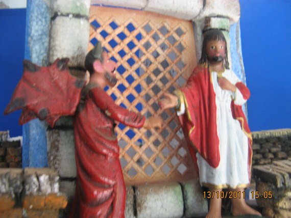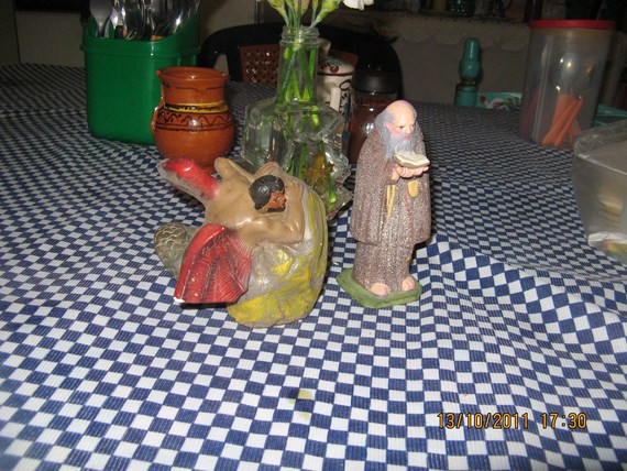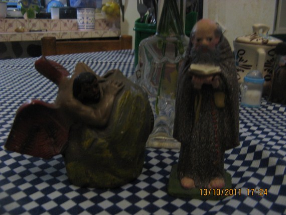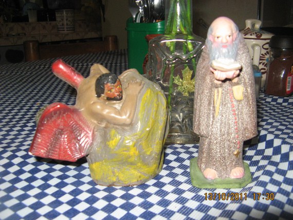 ¡ A propósito del diablo! ...Encontré las figuritas de mi abuelita del santo ermitaño tentado por el diablo, ya son muy viejitas pero se las muestro porque así como vosotros (en España) creo que en alguna región, que no sé cuál es, perdonad mi ignorancia, teneis al "caganer" en el nacimiento mexicano era clásica la escena del santo ermitaño y el demonio. Cosa que en la generalidad se ha perdido, pero algunos aún lo conservan. Vuelvo a decir a los foreros de México que sepan sobre este asunto nos iluminen con sus conocimientos. Saluditos desde México. Los dejo voy a preparar la cena. Besitos