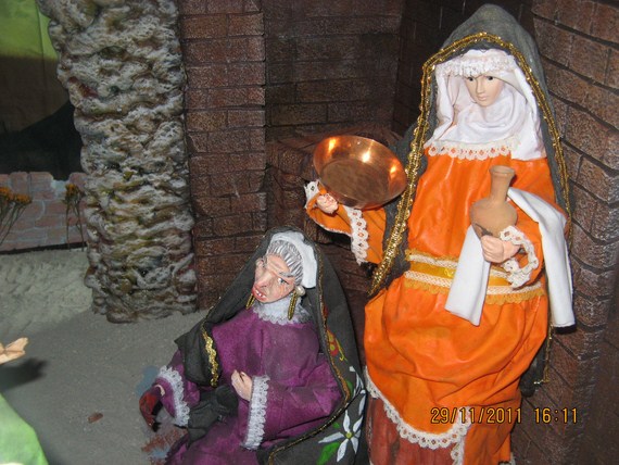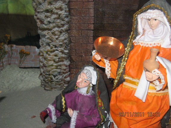 Amigos a la par sigo haciendo algo por la gruta, ya puse a las parteras de belén del apócrifo pseudo-Mateo, que según este libro se llamaban Zelomi y Salomé (una joven otra vieja y parientas entre sí) las dos constatan que María Santísima ha dado a luz a su Hijo, sin perder la gloria de su inmaculada virginidad, y que así doncella y pura tiene los pechos henchidos de leche y que el nacimiento de Jesús tiene características sobrenaturales ya que no ha sido manchado con efusión de sangre (como todos los hijos de Adán) La más vieja tiene dudas y al tocar a la Virgen María se le quema la mano, enmedio de su arrepentimiento y sus ayes de dolor: "Oh Dios de Israel apiádate de mí"-Un ángel le dice que toque con la mano quemada al Niño Jesús ya que Él viene para ser remedio de los pecadores y al hacerlo queda curada. Bueno pues esta es la escena. la pongo a vuestra consideración, las figuras están hechas por una servidora y amiga. Saluditos