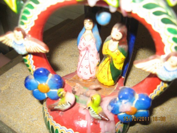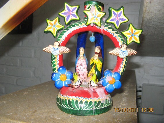 Ciertamente, es lo mismo (El Belén) pero interprétado de otra manera. Igual y diferente, un binomio de concordancias y diferencias, resultado de nuestra civilización mestiza. México recibió parte de su herencia cultural de España (igual que las naciones americanas de habla hispana) pero poseía otra parte igual de rica, los colores representaban a veces a las divinidades otras a los hombres, a los elementos etc. la fusión de sangres y culturas engendraron a nuestros pueblos mestizos y el punto es que ambas brotan en las cosas que hacemos, pensamos, decimos y la expresión artística tiene esa impronta a veces nativa que no es perfectamente original (porque está mezclada con lo occidental) y cuando se interpretan temas del cristianismo (por ejemplo) se incorpora el elemento ancestral indígena, a propósito les quiero mostrar este misterio que es un porta-vela que adquirí en la ciudad de Puebla (México) Me encanta!!!! a ver que os parece a vosotros. Saluditos.