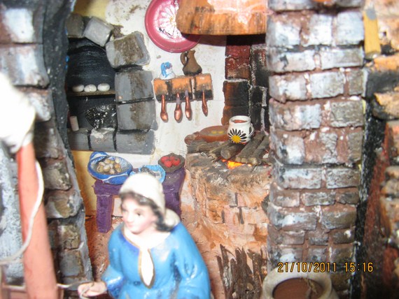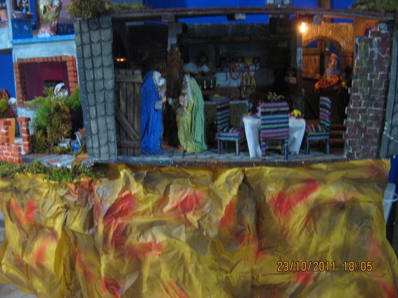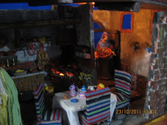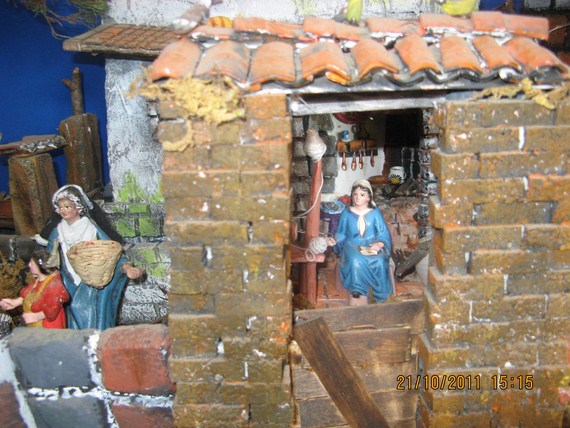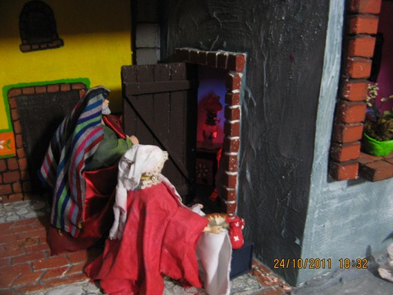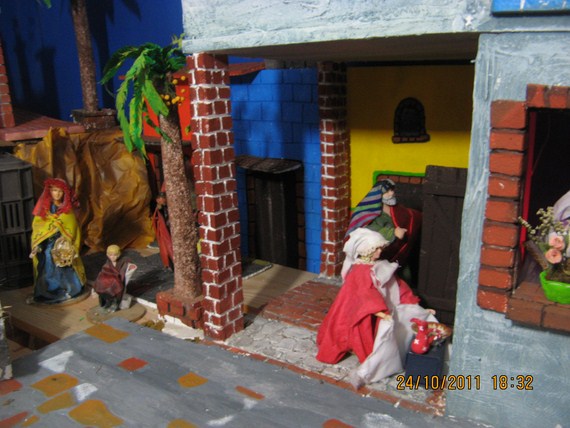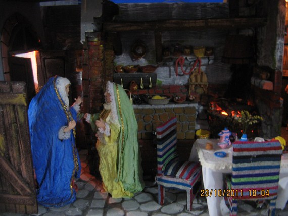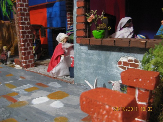 Gracias amigos por sus comentarios, Pilita te voy a subir esta foto de la natividad de la Virgen (desde dentro), santa Ana la está recibiendo ya vestidita se la entrega una de las parteras, otra está levantando los enseres del baño de la recién nacida y una tercera le lleva a santa Ana un tazón con caldo, san Joaquín se encuentra en la puerta, ya en el montaje saqué a la partera arrodillada (de rojo) porque las tres se veían muy amontonadas en la habitación, besitos.