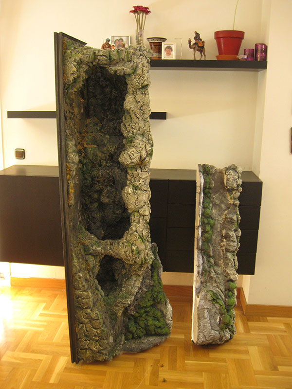 Hola, realmente lo que más se ve está hecho de porexpán, la espuma sólo la usé para rellenar huecos, hacer el interior de la cueva, etc. La parte visible de las rocas está hecha, como te digo, en porexpán, tallado con el cutter, haciendo cortes de manera irregular, dándole relieve, pegando trozos para darle más volumen en algunas zonas, etc. Luego todo cubierto con pasta ("cemento cola") y pintado.