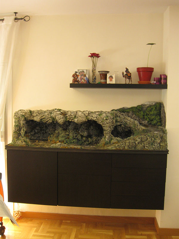 Hola, realmente lo que más se ve está hecho de porexpán, la espuma sólo la usé para rellenar huecos, hacer el interior de la cueva, etc. La parte visible de las rocas está hecha, como te digo, en porexpán, tallado con el cutter, haciendo cortes de manera irregular, dándole relieve, pegando trozos para darle más volumen en algunas zonas, etc. Luego todo cubierto con pasta ("cemento cola") y pintado.