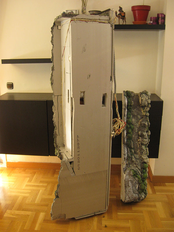 Aquí veis la pieza grande por detrás: para empezar a hacerla, fui poniendo planchas de porexpán en el espacio disponible hasta "forrarlo" por dentro, y el interior de esa "caja" lo fui llenando con más porexpán, espuma de poliuretano, etc., dando forma a la cueva.