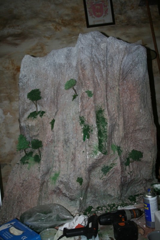Aqui os pongo mi montaña acantilado que ira en un rincon del belen,detras de la boveda.Esta hecha con arpillera y tela con escayola.Los colores utilizados son marron oscuro para fondo y despues varios tonos de marrones mas claros,ocres,rojo y verde y por ultimo un gris claro para la nieve del pico y para sombras y decir que todo esta pintado con un pulverizador(con el envase de un limpiacristales).El pasto verde que hay esta hecho con serrin teñido y con trozos de espuma pasados por la batidora y los arbolitos que hay estan hechos de cuerda peinada y recubiertos con serrin teñido para darle volumen.Dar las gracias a Lupe Soto por orientarme en la eleccion de los colores.Espero que os guste.