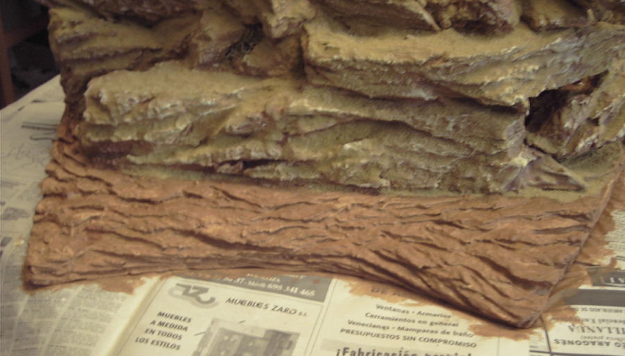 Os voy a poner un paso a paso un peu “incompleto”... mi cámara sigue fallando a veces y solo os he podido hacer foticos de la realización del suelo montañil... pero la técnica empleada en toda la montaña es la misma... porexpan tallado con soldador.