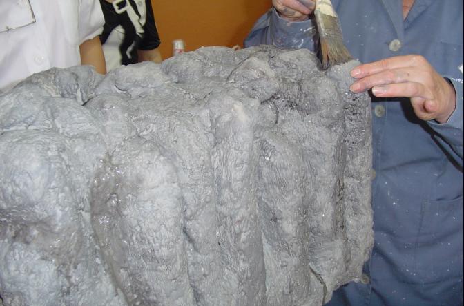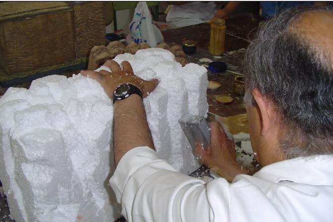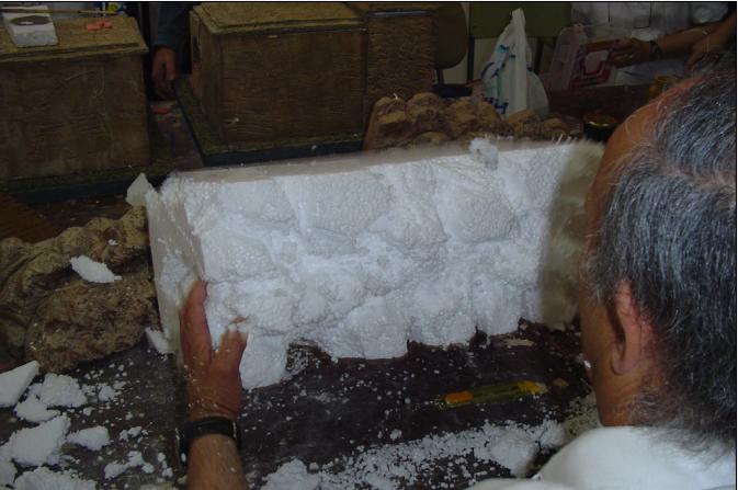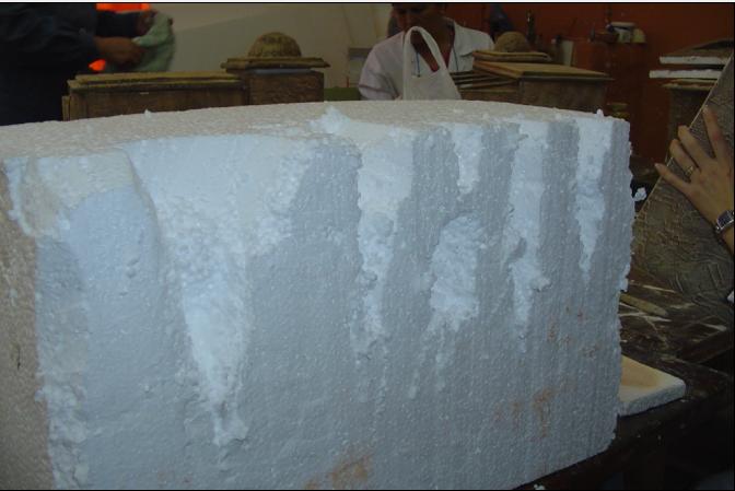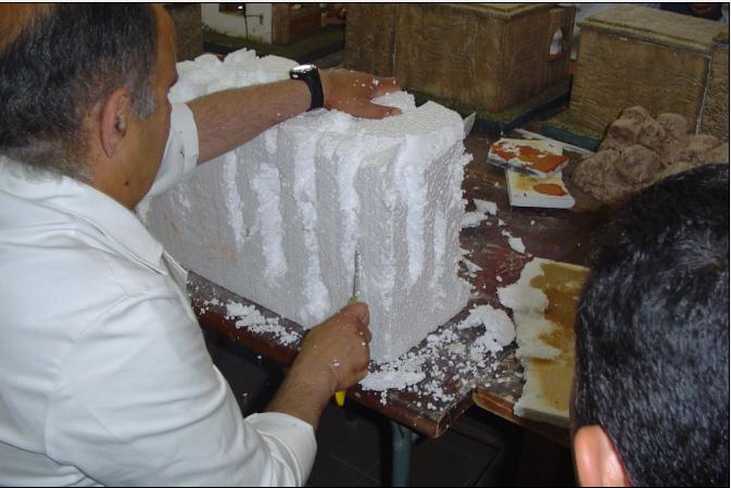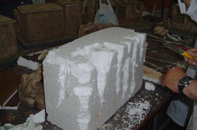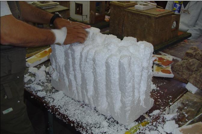 Sobre un taco de porexpan se talla con el cutter y se lija para redondea las aristas.