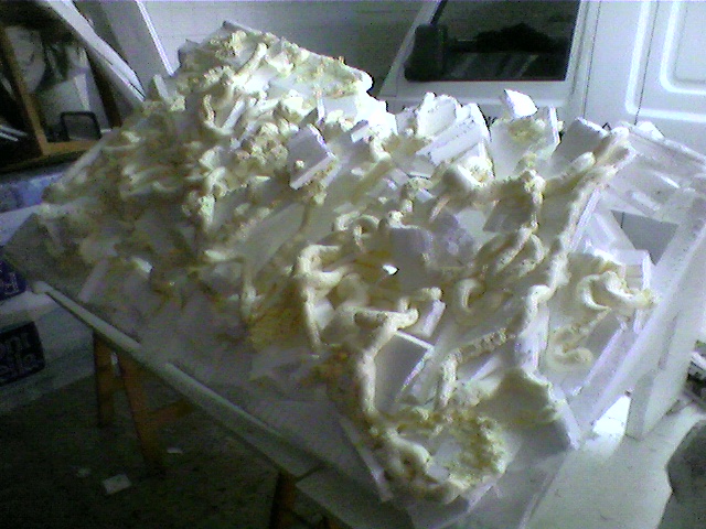 Yo e tallado el cauce del río en esta montaña, y luego le he dado a todo esto con resina de vidrio, que es una masilla que venden en envases como los de pegamento tipico, que se utiliza para tapar abolladuras en los coches. Luego cuando secó esto, le puse un plastico encima y por último le he dado un par de capas con pintura de revestimiento exterior mezclada con agua y cola para poliestireno expandido.