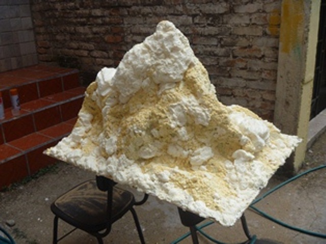 Estas son las últimas montañas que he realizado según el último video de Lola. Yo no he utilizado la espuma de poliuretano directamente por el costo que representa pero he podido conseguir el principio activo de la espuma de poliuretano que es el Poliol mas el Isocianato. Mezclando estos dos líquidos se obtiene la espuma. De un galón de estos dos reactivos se puede cubrir cien metros cuadrados. El costo del galón en el ecuador es de 12.00 dólares unos 9 euros aprx.