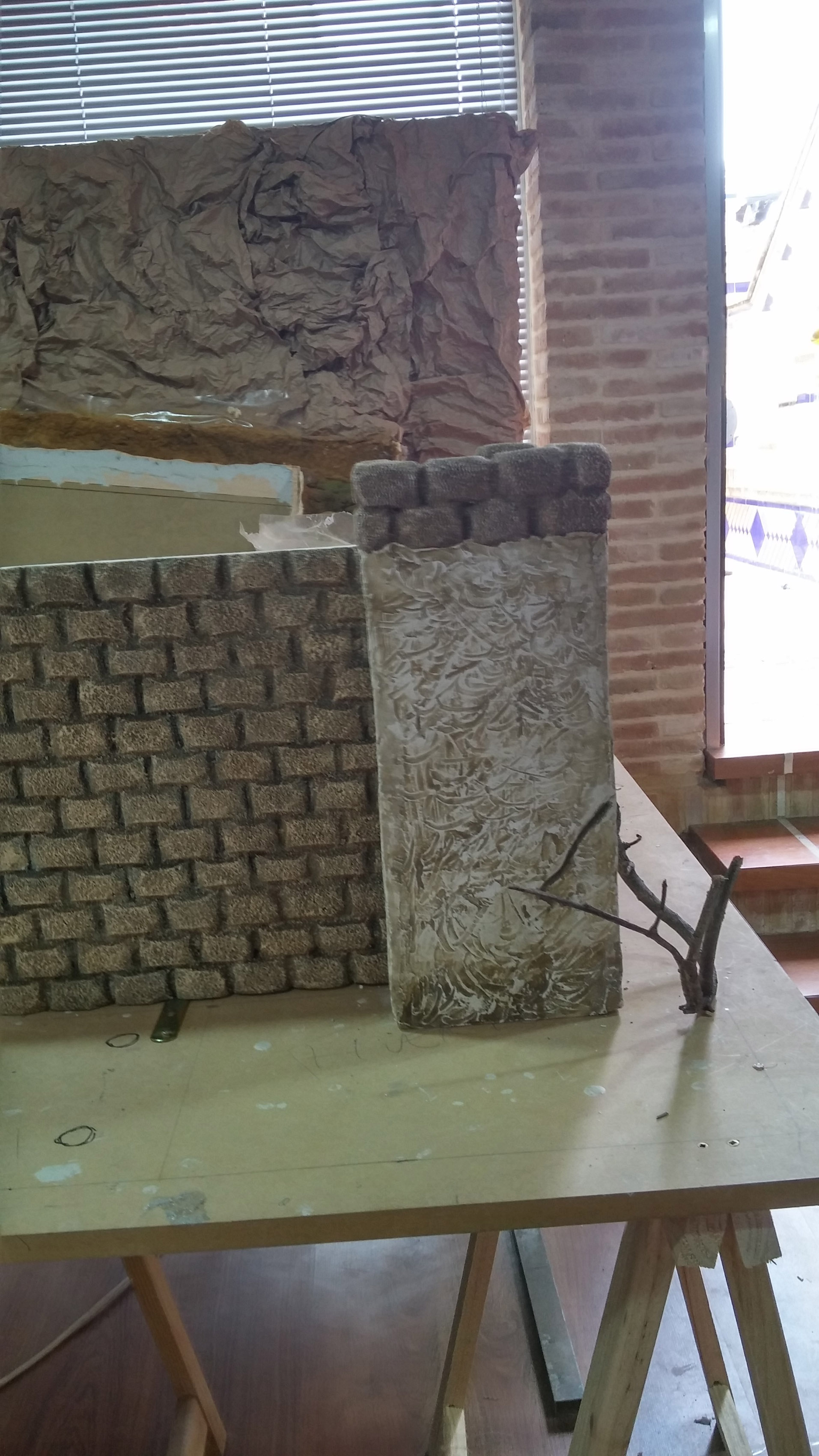 Muy buenas tardes amigos. Pues el fin de semana pasado aproveché que vino mi tío Fran "el manitas" y fuimos dos para avanzar el belén. La verdad, que junto a él se avanza mucho más, bastante más que cuando soy yo solo... Al grano, a la principal puerta de la muralla le faltaba la pilastra derecha, como alguno de vosotros bien dijo, que ya está acabada. Decidimos que en la esquina tenía que ir una torreta de control, así que la diseñamos y nos pusimos manos a la obra, trabajo que también acabamos. Y también, respecto a la muralla, estuvimos tallando y enfoscando la 2ª parte de esta, trabajo que no terminamos, pero que sí haremos esta semana que entra pues ya hemos acabado el instituto. Mi tío Fran, como buen experto en bellas artes, es el que me lleva el trabajo "ARBOLES SECOS". Esto es un tema que se va un poco de las manos por lo que dejo al experto que actúe jejejejeje. Como anterior día dije en otro mensaje, crearé un post para explicar este procedimiento. Como siempre digo, muchas gracias por vuestra atención. Pediría consejos de expertos como vosotros, pues esto empezando en esto y me gusta aprender cosas nuevas todos los días. Gracias una vez mas.