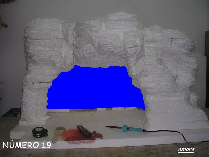 Mario, si te refieres a la pared que he pintado de color azul en la foto número 19, efectivamente, puse una pieza vertical de poliestireno expandido de 5 cm. de grosor por 30 cm. de alta, como indico en la foto número 20. Sobre dicha pieza pegué las piezas número 1 y 2 que indico en la foto número 21. Tenía que haber sacado una foto de la parte trasera de la fotografía número 1 y hubiera quedado muchísimo más claro.