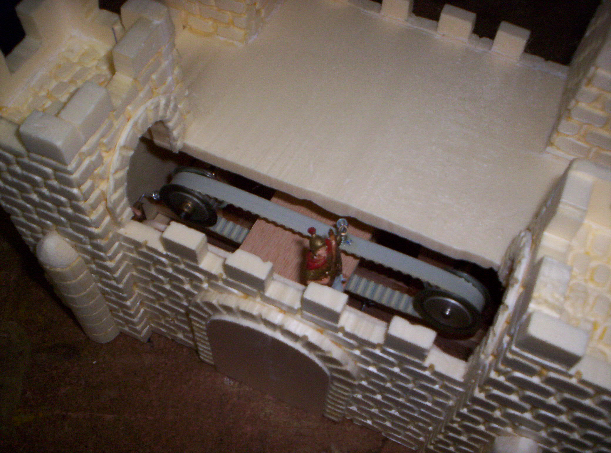 Te adjunto unas fotos de un mecanismo que hice yo para simular la guardia de los soldados romanos. Espero que te sirva de idea / ayuda.