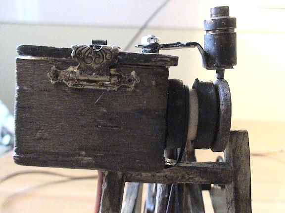 El año pasado, funcionaba con un pequeño motor de corriente continua, alimentado por un trasformador, este motor hacía girar la piedra afiladora y con una goma esta movía la rueda grande.