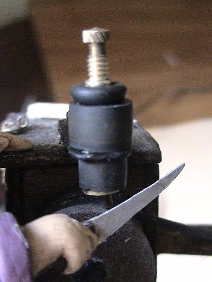 Hice una abertura justo donde tenía la marca, con los extremos un poquito más anchos y por debajo pegué alrededor una arandela de goma, procurando que la goma quede más cerrada que la abertura de madera, para que al rozar la goma no se corte con la madera.