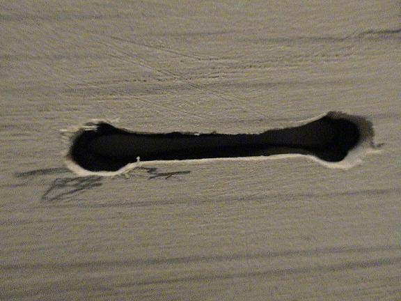 Hice una abertura justo donde tenía la marca, con los extremos un poquito más anchos y por debajo pegué alrededor una arandela de goma, procurando que la goma quede más cerrada que la abertura de madera, para que al rozar la goma no se corte con la madera.