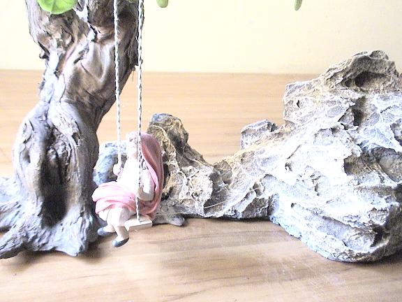 Ya montado, se ve el hilo que va de la roca al columpio. ( si no se ve, se adivina )