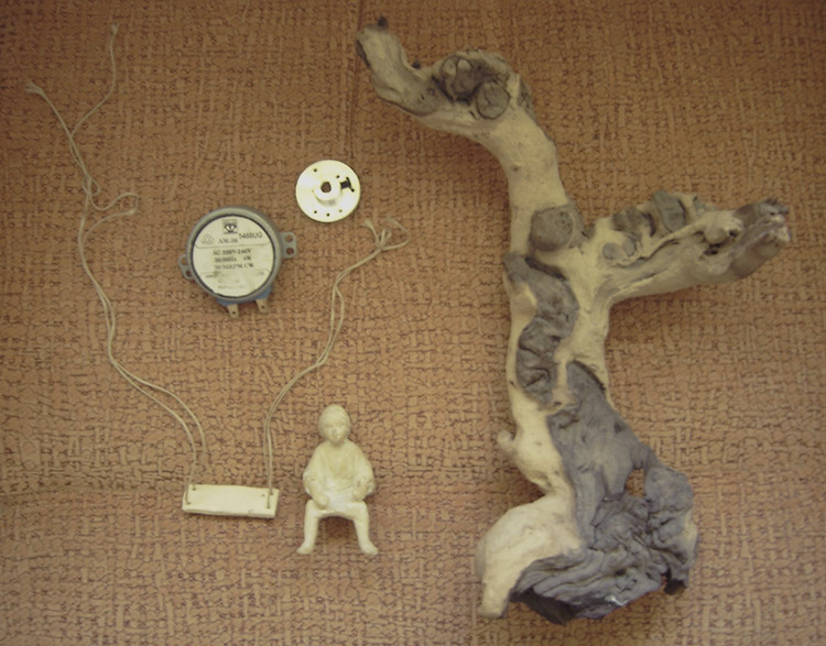 El motor ya montado y colocado dentro de la roca, por el agujero que se ve en el centro de la roca, es por donde sale el hilo de pescar que va al centro de la tabla del columpio, las tuercas que se ven en el tornillo, son para que la pieza que gira no quede muy suelta, ( la pieza donde va atado el hilo ) solo lo suficiente para girar. Si el tornillo es más corto no hacen falta las turcas, pero siempre es bueno poner alguna, para que el hilo no roce con el disco.