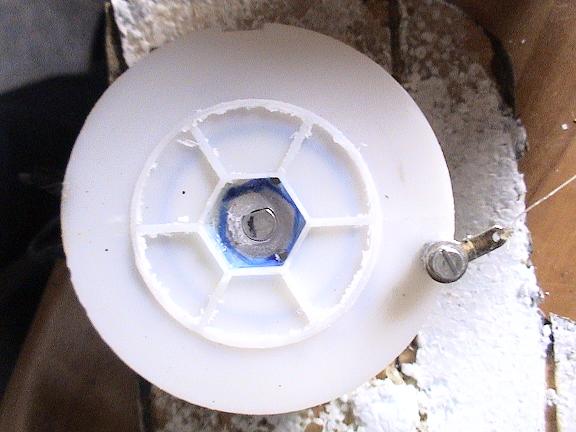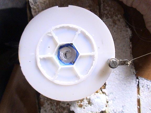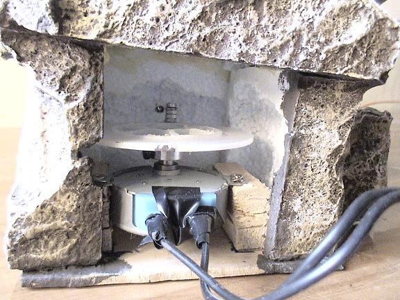 El motor ya montado y colocado dentro de la roca, por el agujero que se ve en el centro de la roca, es por donde sale el hilo de pescar que va al centro de la tabla del columpio, las tuercas que se ven en el tornillo, son para que la pieza que gira no quede muy suelta, ( la pieza donde va atado el hilo ) solo lo suficiente para girar. Si el tornillo es más corto no hacen falta las turcas, pero siempre es bueno poner alguna, para que el hilo no roce con el disco.