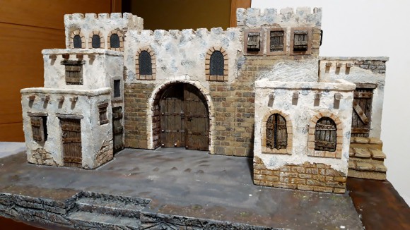 Hola chema. El portón esta tallado en poliestireno expandido y pintado con efecto madera. Los refuerzos metálicos están hechos con cartón de las cajas de cereales y pintados con efecto metal oxidado. Los dos efectos puedes encontrarlos en este foro o en internet. Lola Temprado tiene buenos tutoriales y muy bien explicados. Los clavos y tiradores son comprados en una tienda de belenismo. Pocos post mas abajo de este esta el tutorial con las fotos del Portón.