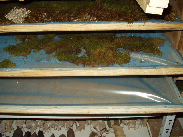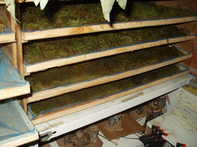 Para ello, en una bandeja de madera le he puesto un plástico sobre el que he echado mantillo de macetas sobre el que he colocado el musgo. Para apilar varias bandejas, he hecho un especie de cajonera como se puede ver en las fotos. En las imágenes he puesto como hago el proceso paso a paso.