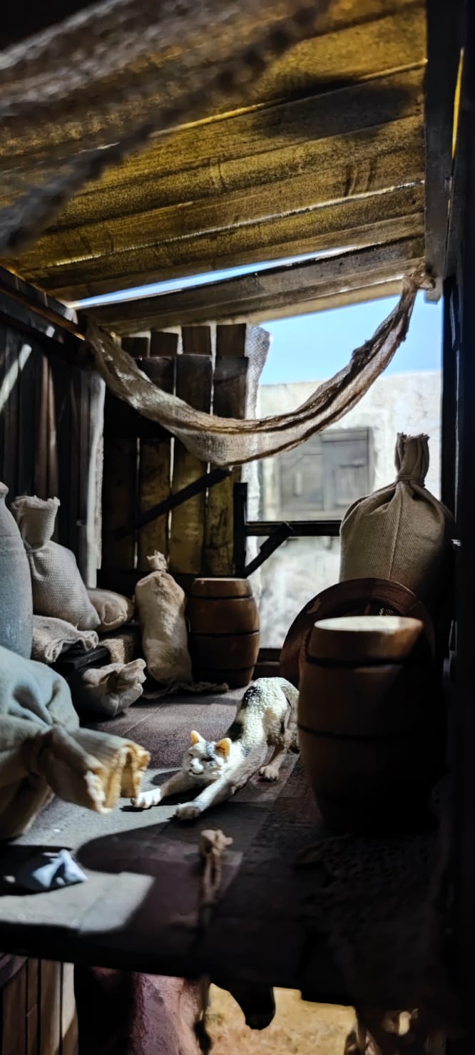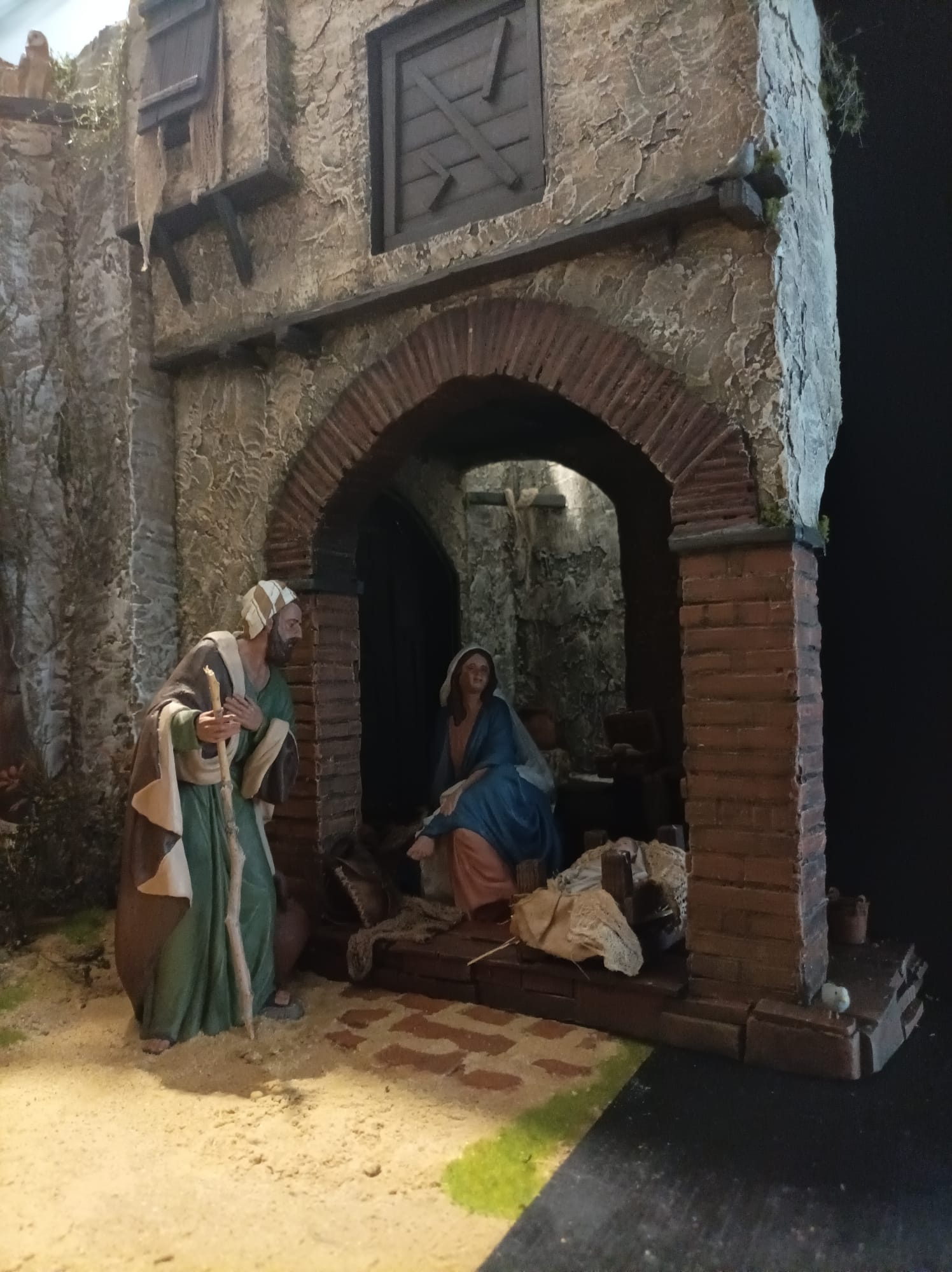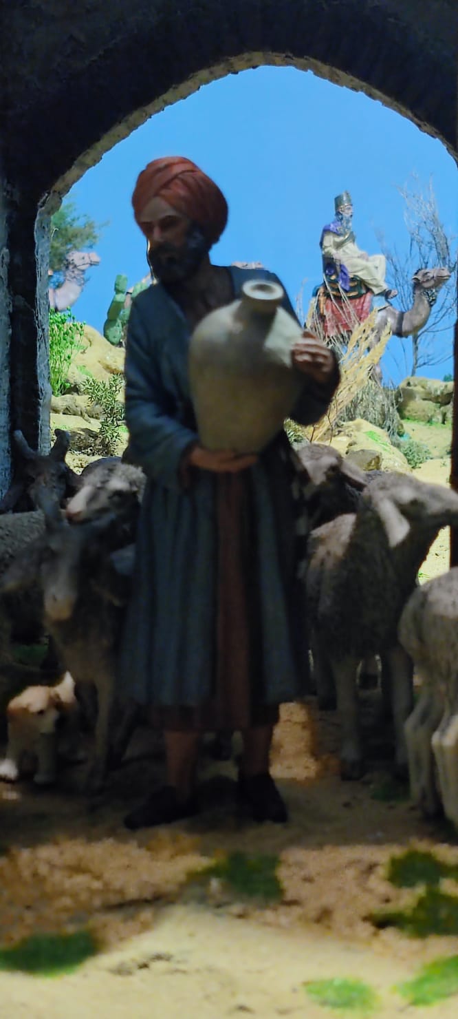 Bonito belén, muy trabajado y con grandes detalles y complementos. A destacar la preciosa fotografía del hombre con la tinaja en primer plano, y al rey Melchor apareciendo en la lejanía en un segundo término.