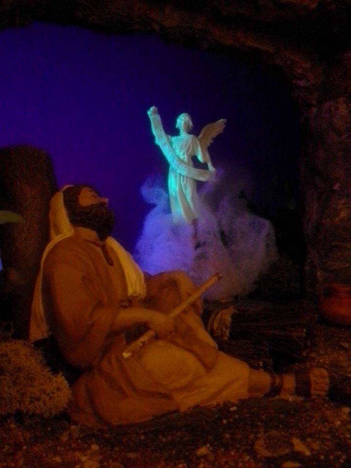 en el trata la "anunciación a los pastores" de una manera original, como nos va acostumbrando en sus obras, ya que mientras los pastores duermen el ángel se les presenta en el sueño notificándoles la Buena Nueva
