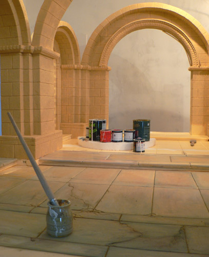 De este Nacimiento, lo que recuerdo es haber dado una base de color caqui (negro + ocre) suave (añadiendo blanco) tendente a marrón (casi siempre uso el mismo color de base) y encima ya directamente obteniendo el tono ocre que se ve por adición de varios (naranjas, amarillos, ocre, azules, rojos, blanco...). En realidad, todos esos colores están en cada piedra. Lo importante es pintar una a una (no a brochazos continuos que recorran toda la pared de un extremo a otro). Unas piedras quedarán con más o menos azul, rojo, etc ...pero todas tendentes al ocre. El aspecto general será de existencia de un sólo color.