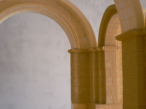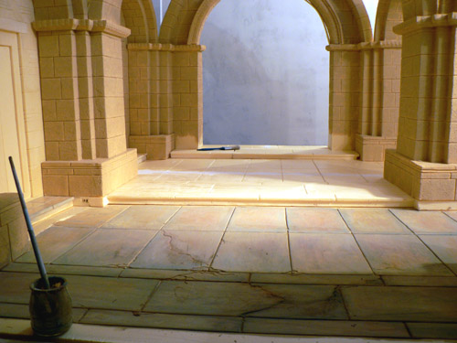 De este Nacimiento, lo que recuerdo es haber dado una base de color caqui (negro + ocre) suave (añadiendo blanco) tendente a marrón (casi siempre uso el mismo color de base) y encima ya directamente obteniendo el tono ocre que se ve por adición de varios (naranjas, amarillos, ocre, azules, rojos, blanco...). En realidad, todos esos colores están en cada piedra. Lo importante es pintar una a una (no a brochazos continuos que recorran toda la pared de un extremo a otro). Unas piedras quedarán con más o menos azul, rojo, etc ...pero todas tendentes al ocre. El aspecto general será de existencia de un sólo color.