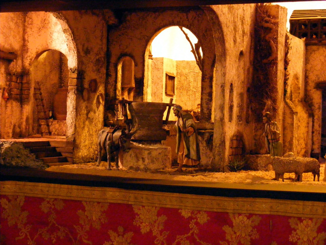 La temática del Nacimiento está centrada en el pesebre, pero lo hemos contextualizado dentro de una área industrial dedidado a la molienda del trigo y la elaboración del aceite.
