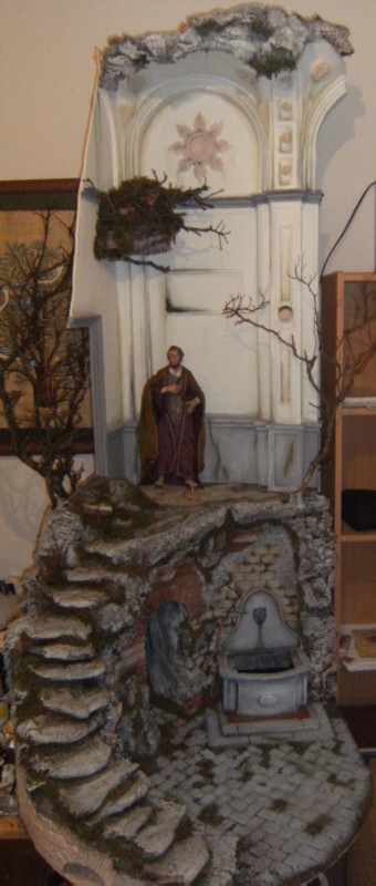 Aunque aún no está terminada del todo, os dejo la escenografía que he realizado para mis figuras napolitanas este año. El modelo no es original, está realizado con la técnica del 700 napolitano, madera, corcho y corteza de corcho, estuco y pintura. Como no dispongo de muchas figuras solo se trata del Tempio y la fontana.
