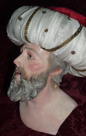 En la foto no está aún barnizada. Después de que secara muy bien el óleo( sin pulir, dada la superficie tan pequeña) he patinado muy poco( porque he trabajado mucho la policromía y me gusta así, además no quería ensuciar) con acuarela y un trapo limpio, sin más. La acuarela es mucho más estable que cualquier otra cosa, y aquí aprovecho mis conocimientos de restaurador. Precisamente por eso, tras alguna prueba y respetando todos los criterios, he barnizado con barniz de retoque LeFranc( sé lo que dices, sangregorio, porque habitualmente colaboro con el IAPH), que se parece un poco al satinado. Una vez seco, he dado una segunda mano de dicho barniz, pero sólo en los labios, para darle mayor naturalismo. El resultado me ha parecido satisfactorio, para ser la primera( espero mejorar bastante); ya lo veréis, y esta vez ya vestida.