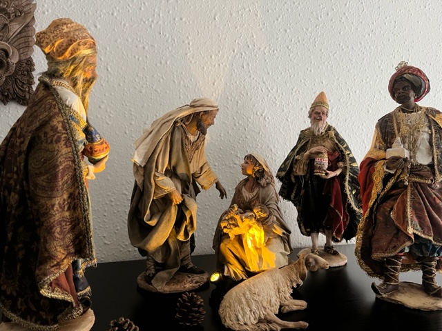 Os presento mi natividad, con figuras de 30cm de Angela Tripi. Este año he incorporado unos pequeños focos para iluminar las figuras, aunque la foto no hace demasiada justicia.