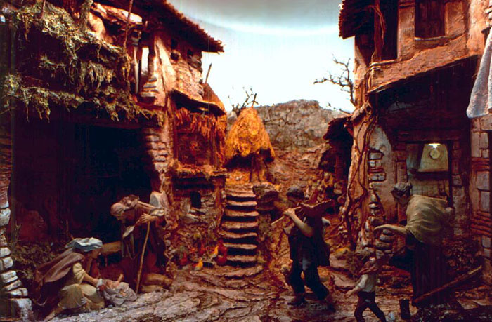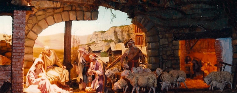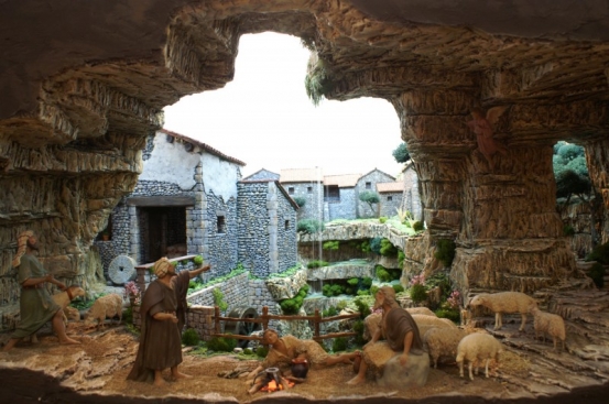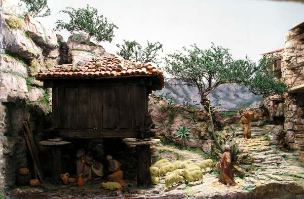 "Los pastores", escena realizada por Antoni Casulleras para la exposición de la iglesia de Belén, en Barcelona. Las figuras son de Castells.