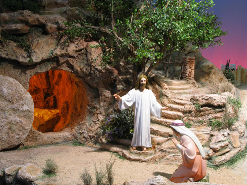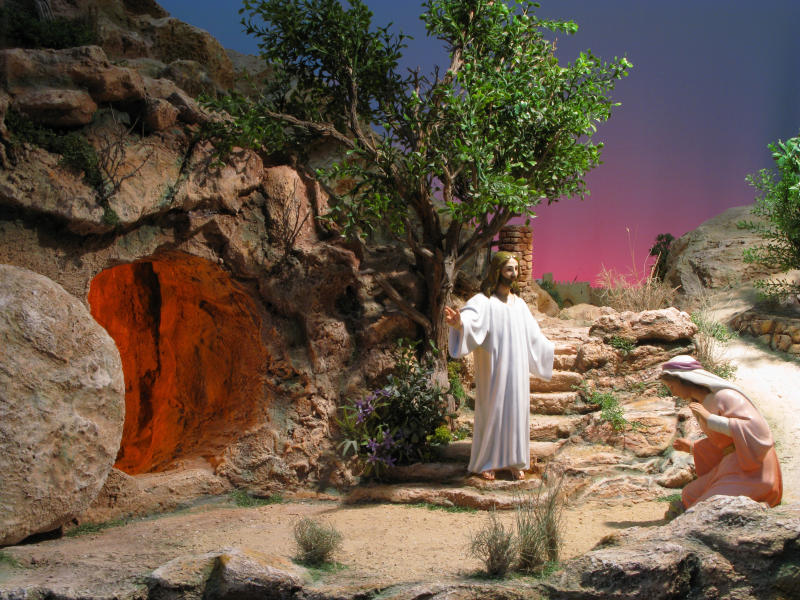 "Aparición de Jesús resucitado a María Magdalena", gran escena con figuras de Olot en 30 cm, realizada por Antonio Alonso para la Exposición "JESÚS, EL CRISTO" de la Asociación de Belenistas de Alicante.