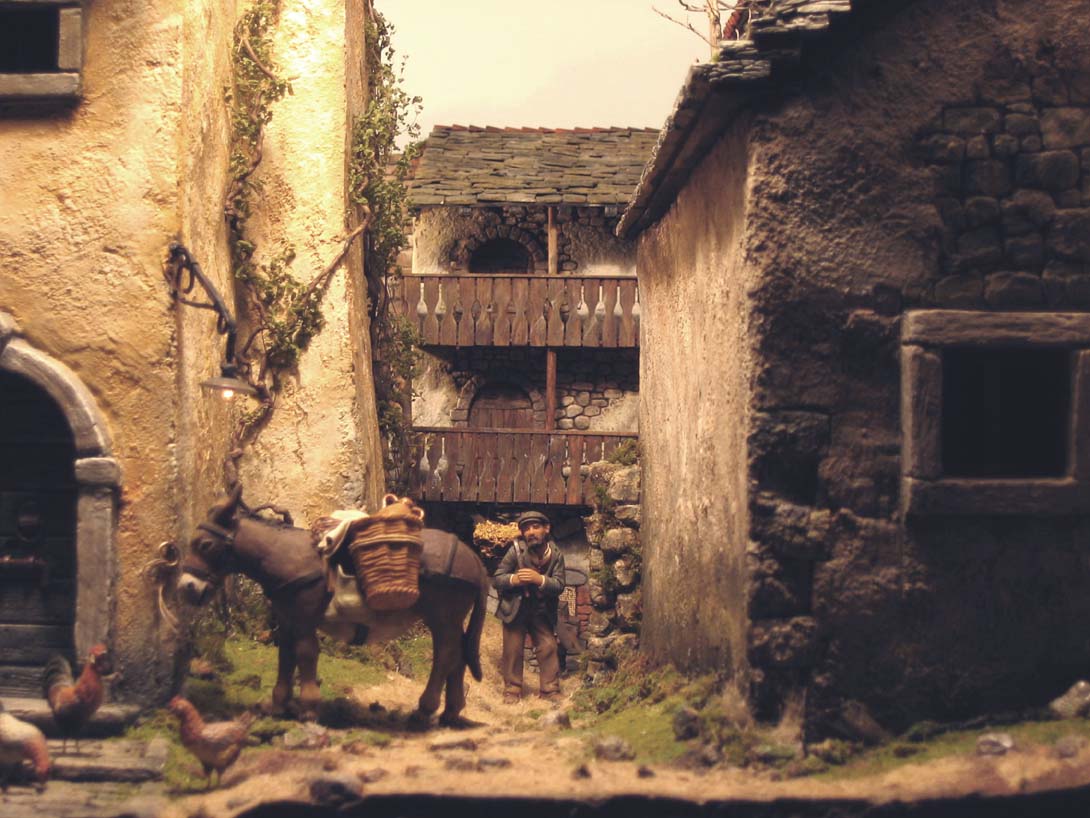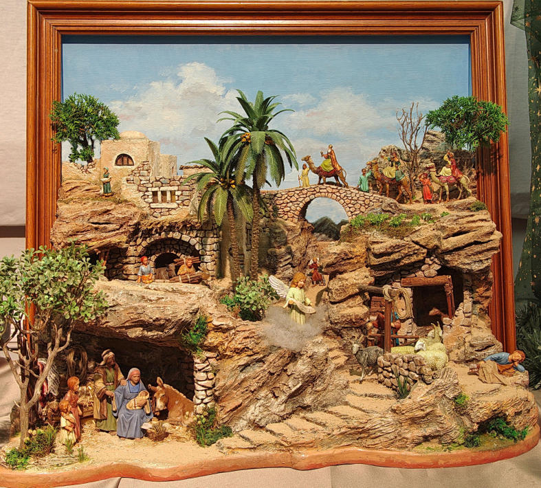 Belén cuadro por Joaquín Sirvent con figuras de 8 cm a 3 cm para crear un gran efecto de perspectiva en apenas 5 cm de profundidad.
