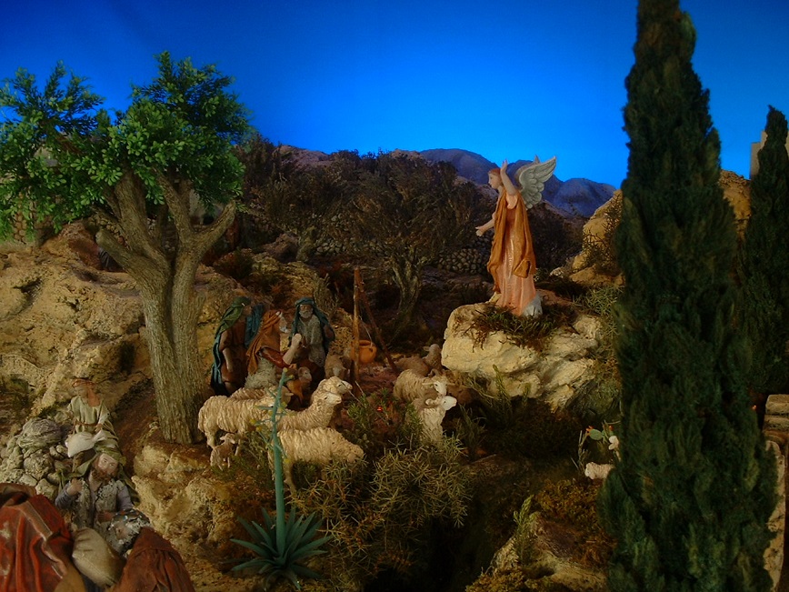 El anuncio a los pastores, en un belén de Juana Moreno con figuras de la escuela murciana.
