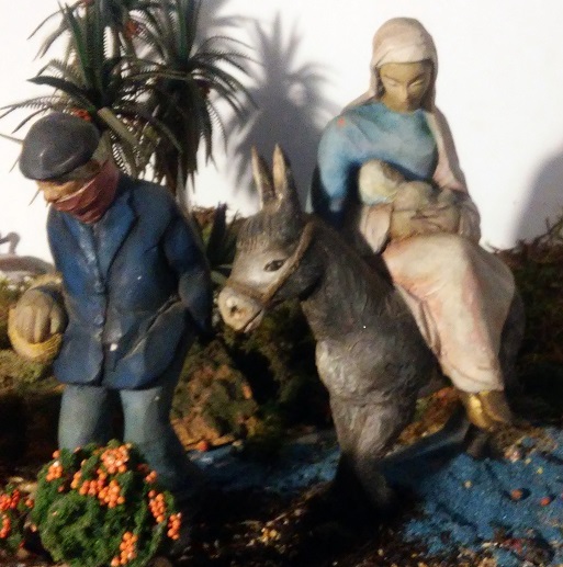 Las figuras de Emili Colom son de dos tamaños ligeramente diferentes, el nacimiento y los pastores corresponderían a unos 28 cm, la huída a unos 20 y los Reyes quizás son algo más pequeños. Son unas figuras muy originales que compré hará unos ocho años y que tenía un poco relegadas, porque en la vitrina lucen poco. En cambio, dentro del belén son espectaculares. Os pongo el enlace a la página de información de Colom, que es muy interesante. No era un artista de primera línea, pero sí un gran conocedor del arte románico catalán y un buen imaginero.