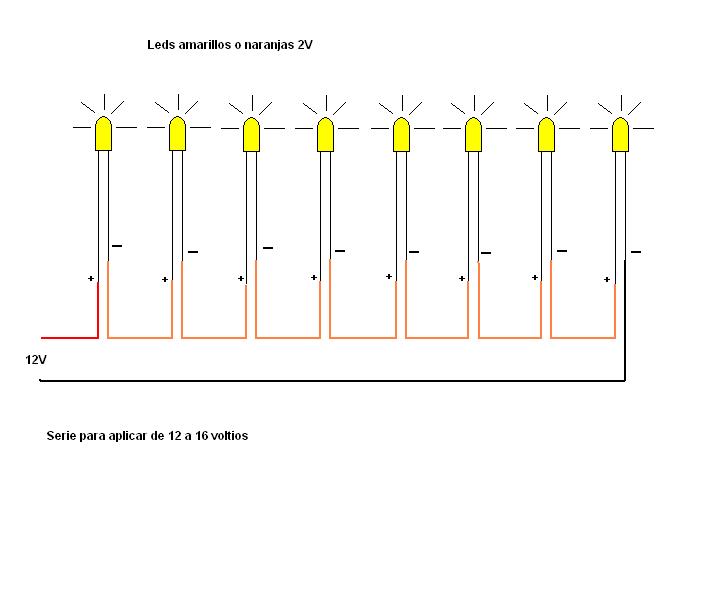 serie 12v.JPG (26KB - 369 descargas)como te comente antes hay que tener en cuenta si lo conectas en serie o paralelo lo que comenta el compañero david es corecto ya que como tu lo hiciste en la formula la resistencia que se obtubo es muy pequeña y no exixte comercialmente por lo tanto se hace despresiable y no es necesario colocarla pero recuerda que esto depende del numero de led que coloques si colocas muchos led en serie la fuerza de iluminacion del led ira decresiendo y se vera opaco lo mismo que si a un led le colocas una resistencia un poco mas alta de la que le coresponde veras que esta enciende un poco menos y si se le coloca una resisitencia mas baja el led iluminara mas pero se acorta la vida util de esta ya que le estaras entregando mas de 20 ma en alguna ocasion conecte series de led directamente a 110vac a udtedes es 220vac con una sola resisitencia de calor de 5 watios pero esto es mas complicado hare un paso a paso y luego lo montare recuerda la resisitencia es para limitar la corriente y por lo tanto para conservar la vida de tu led. a seme olvido colocar esto en el anterior post