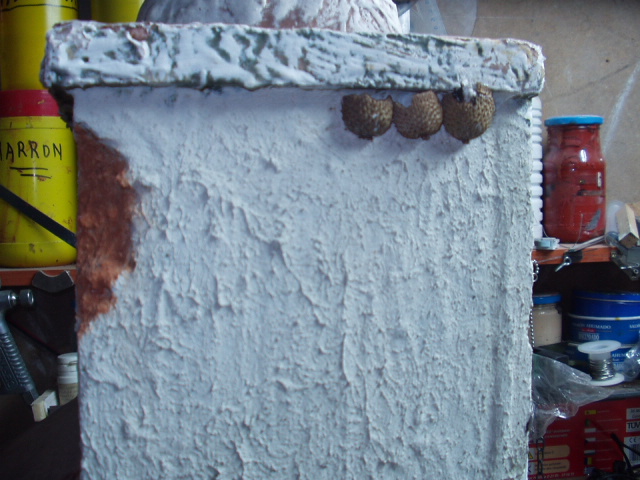 2º cortamos casi por la mitad y lo pegamos en las cornisas o vuelos de los tejados y hacemos un corte para la entra de las golondrinas