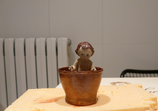 El lunes me compré este niño Jesús pequeñico para completar un nacimiento y resultó grande. Se me ocurrió copiar la escena del niño en el baño, así que le he cortado al pobre la corona. A que se parece al niño del columpio de mim!!
