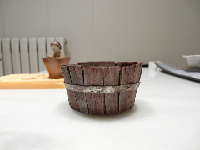 La idea del barreño de madera, hecho con tarrina de flan Dhul recubierto de trocitos de madera de balsa, la he tenido que cambiar por trozo de Actimel pintado de cobre, todo me queda grande.