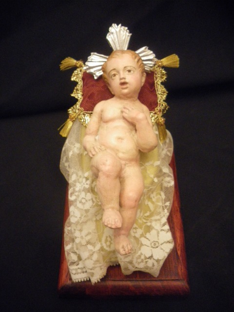 Realizo figuras de niño Jesús para 35cm ,estan hechos en pasta cerámica y policromados al oleo, se presentan tal como en la foto con potencias y peana de madera para exponerlo cuando no esté en el Belen.