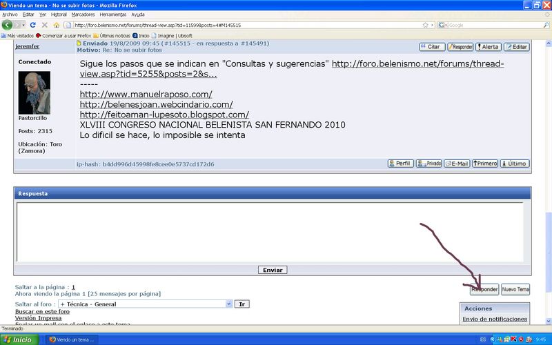 Primero le das a la tecla "Responder" (abajo a la derecha). Sale el Editor. Escribes el texto y pones la marca en "Adjuntar un archivo antes de enviar". Das a "enviar". Sale otro cuadro de diálogo. Das a "Examinar" y lo buscas en tu dico duro. Cuando lo localices lo picas y abrir. Ya tienes la ruta en el cuadro de diálogo, ahora sólo queda dar enviar y ya está.