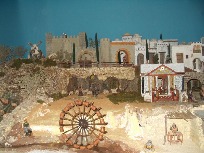 Cuando he realizado norias en mis belenes, normalmente las pongo detras de alguna construcción de primer plano, de formas que se vea media noria. Al eje de la noria le instalo un cojinete metalico con lo que consigo que con la minima gota de agua se mueva. Tambien puedes colocar un motorcito en el eje para que la noria se mueva y haces que el agua le caiga por arriba .